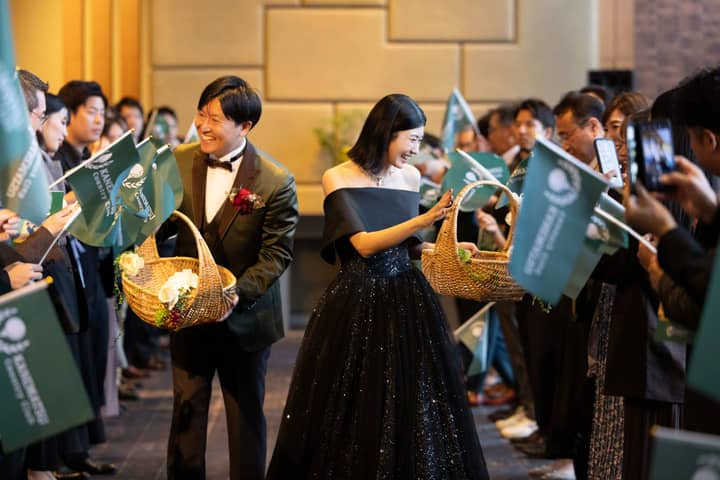 挙式後のセレモニーでは手作りの「フラッグ」をゲストにお配りし花道で新郎新婦をお迎えしていただきました。